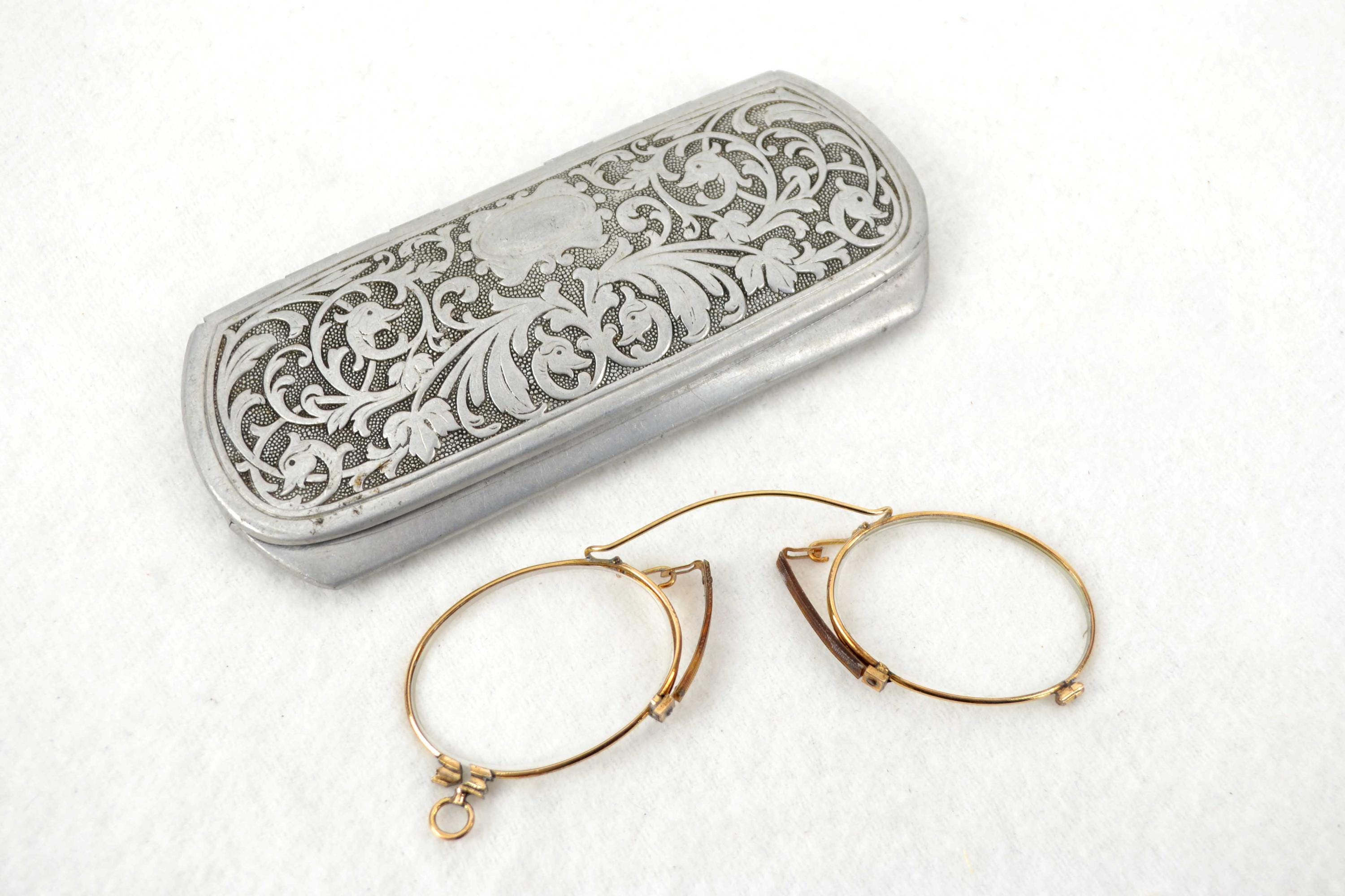 Rari occhiali a pince-nez in oro 10K con custodia, occhiali serie 4...
