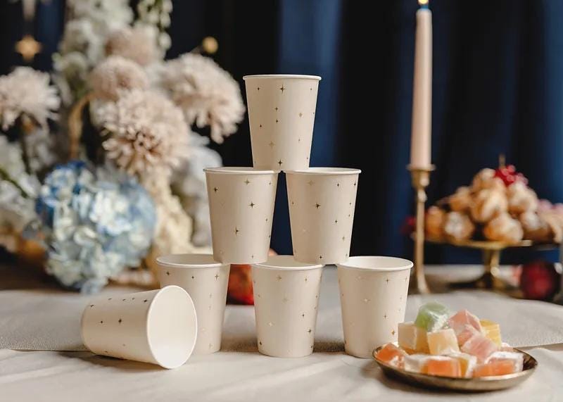 Fai brillare la tua festa come le stelle con questi eleganti bicchieri di carta color crema. Sono de...