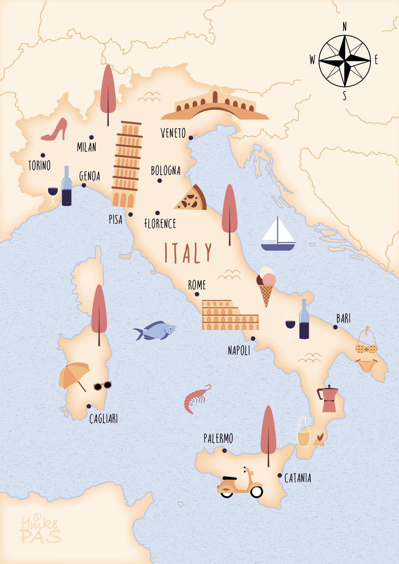 Cartolina Italia, confezione da 5 cartoline A6, mappa illustrata de...