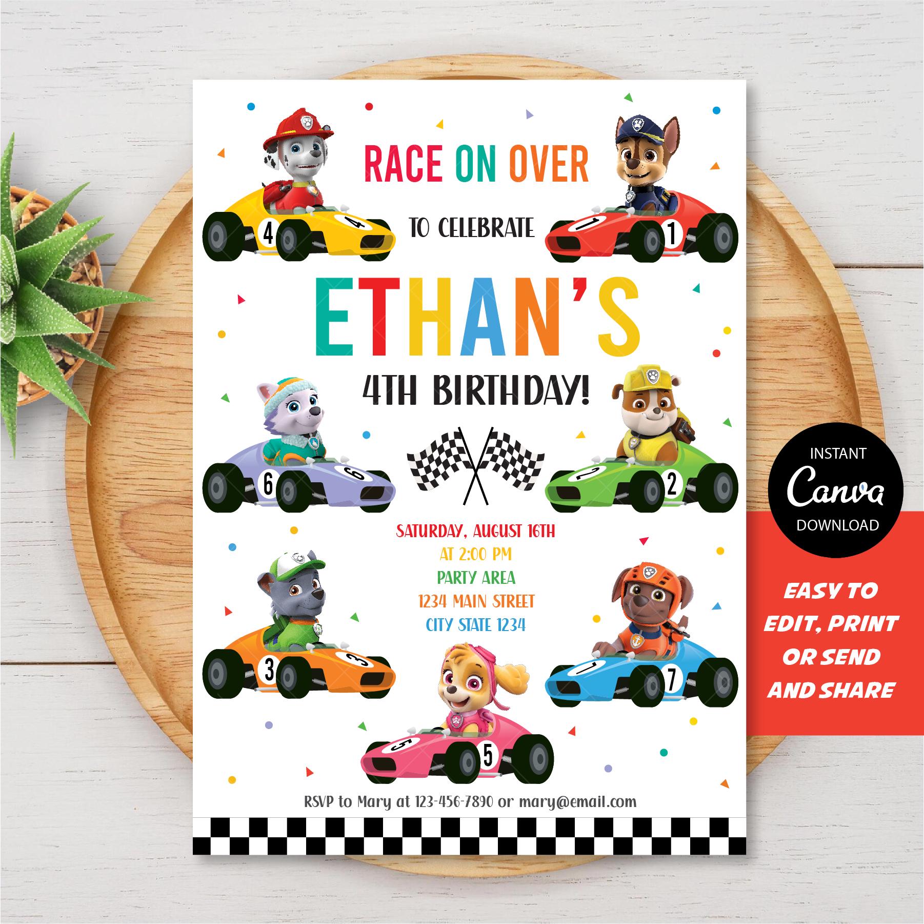 Invito modificabile per auto da corsa Puppy Paw-ty, invito di compl...