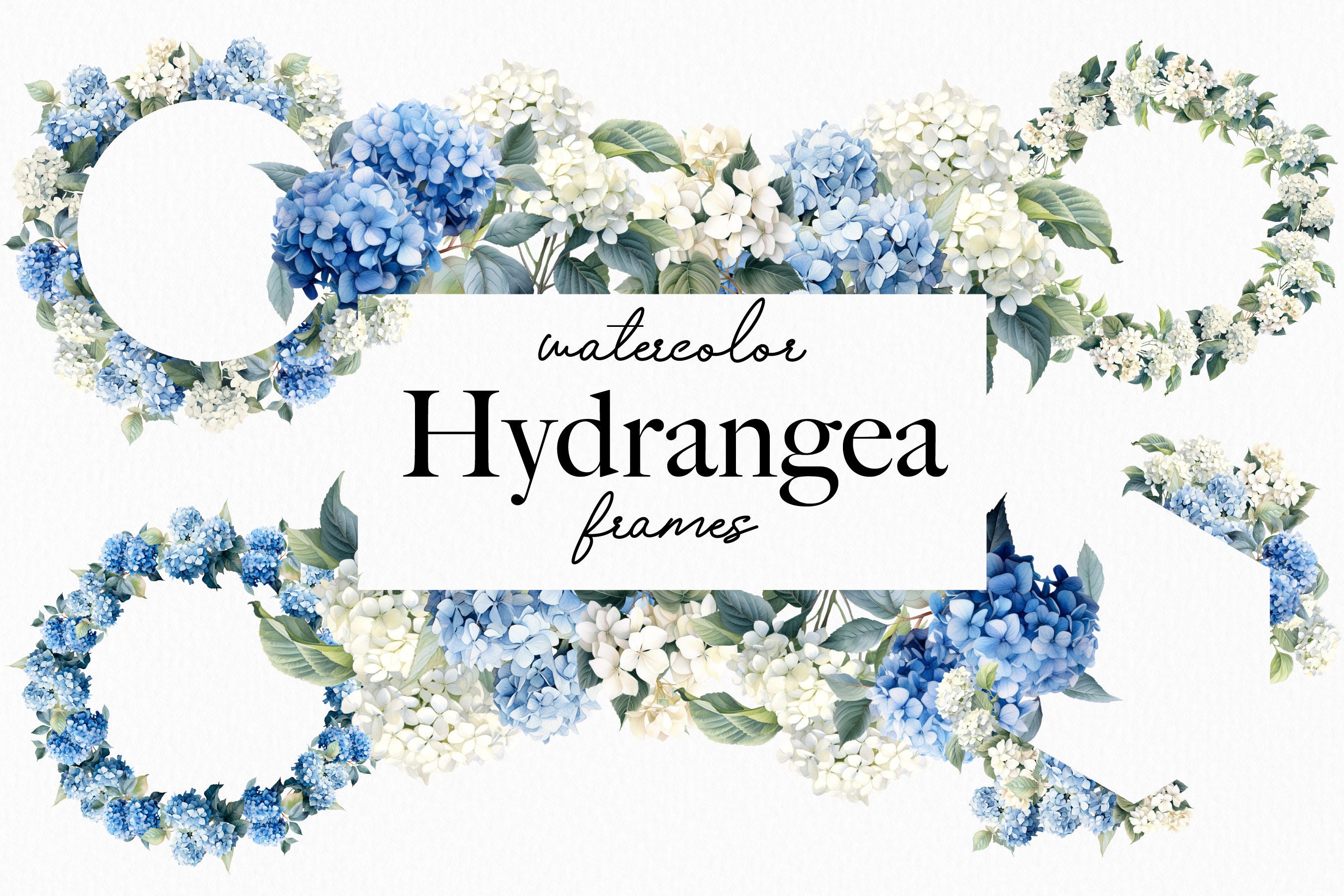 Cornici per acquerelli di ortensie, ortensie floreali blu Png, ghir...