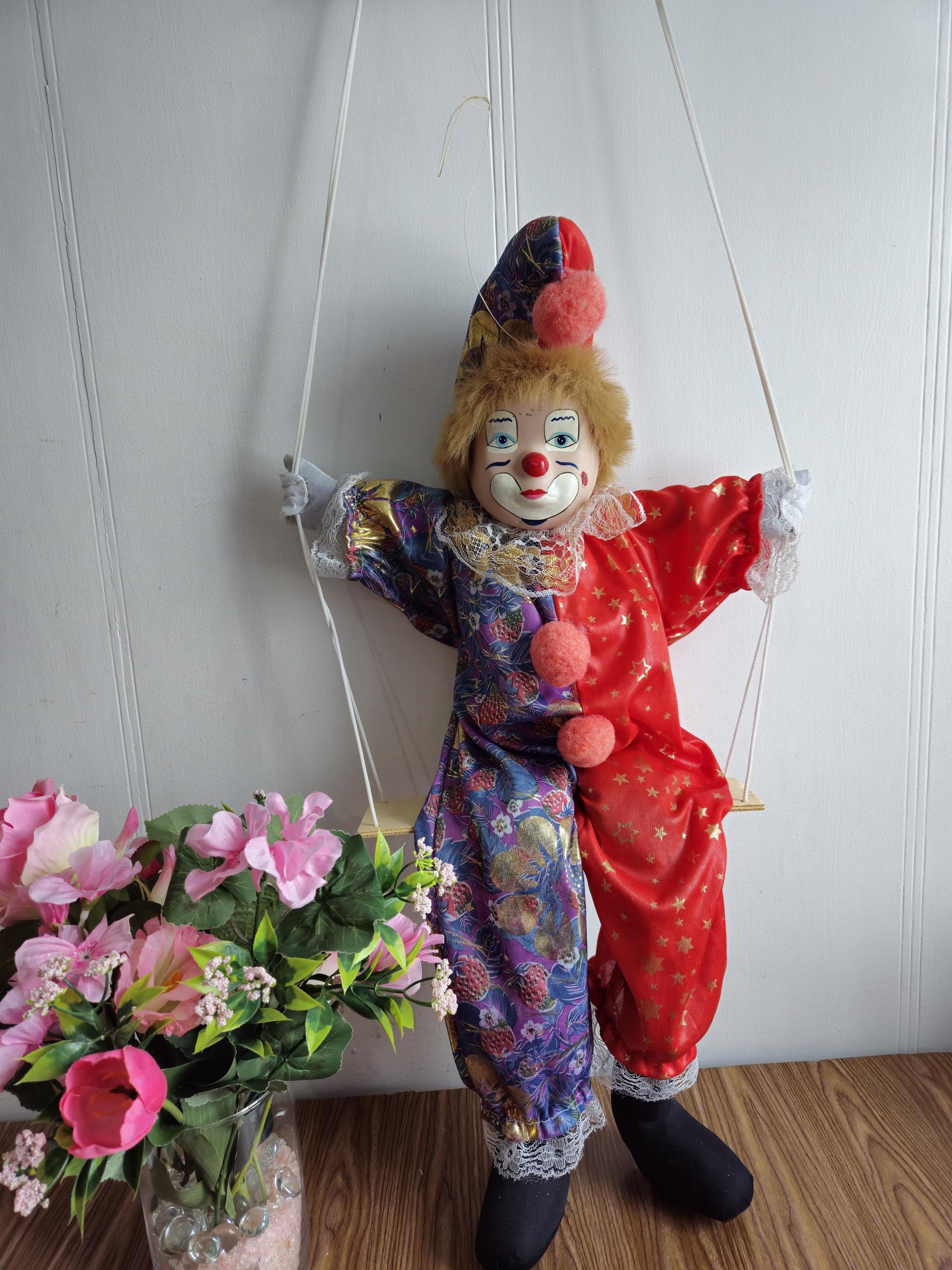 "Bambola clown d'epoca sulla sua altalena, vecchio clown degli anni '80 con etichetta \"Lb...