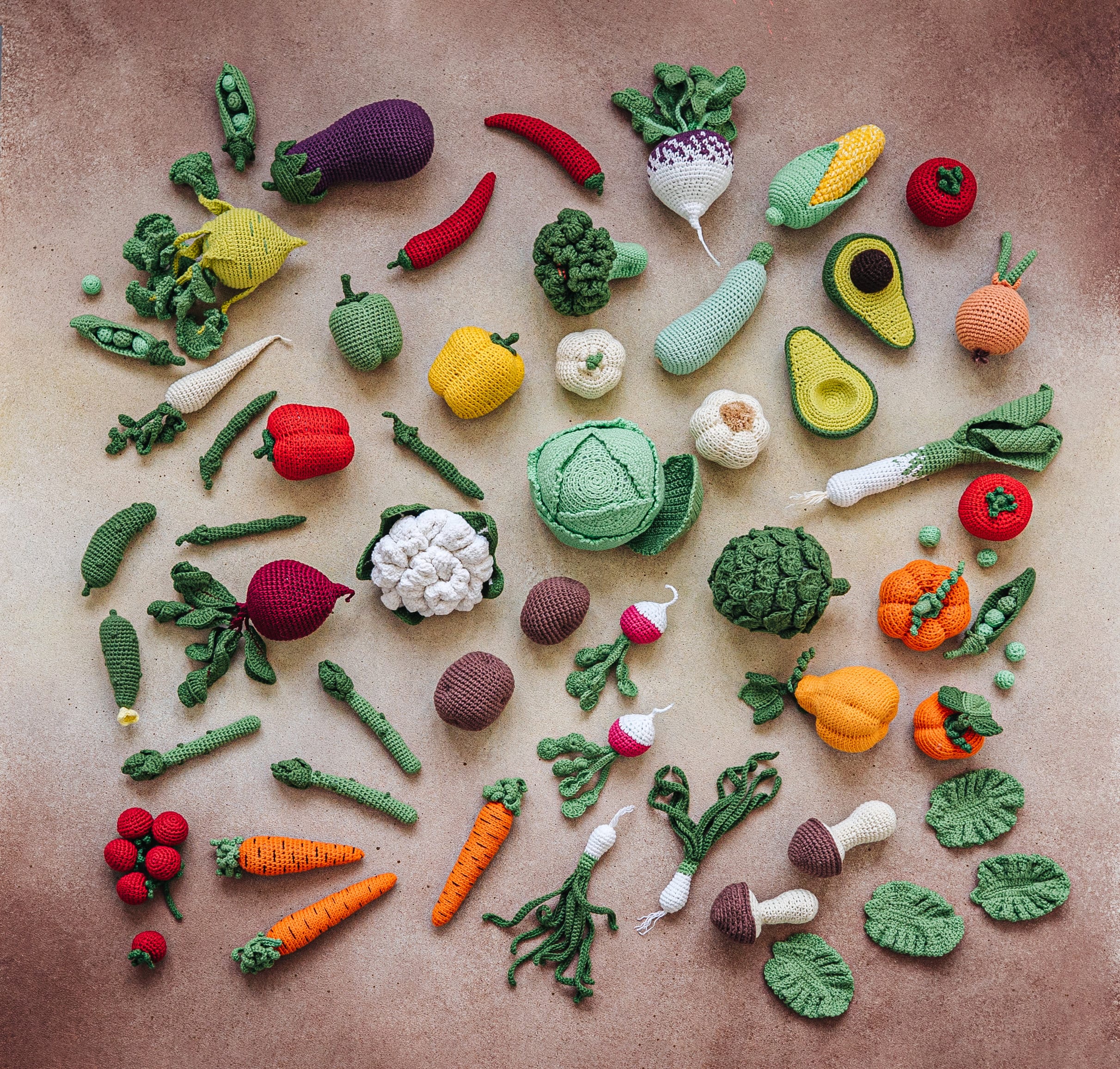 Crea il tuo cibo giocattolo all'uncinetto. Verdure ESTIVE: cavolo rapa, pomodoro, piselli verdi nel ...