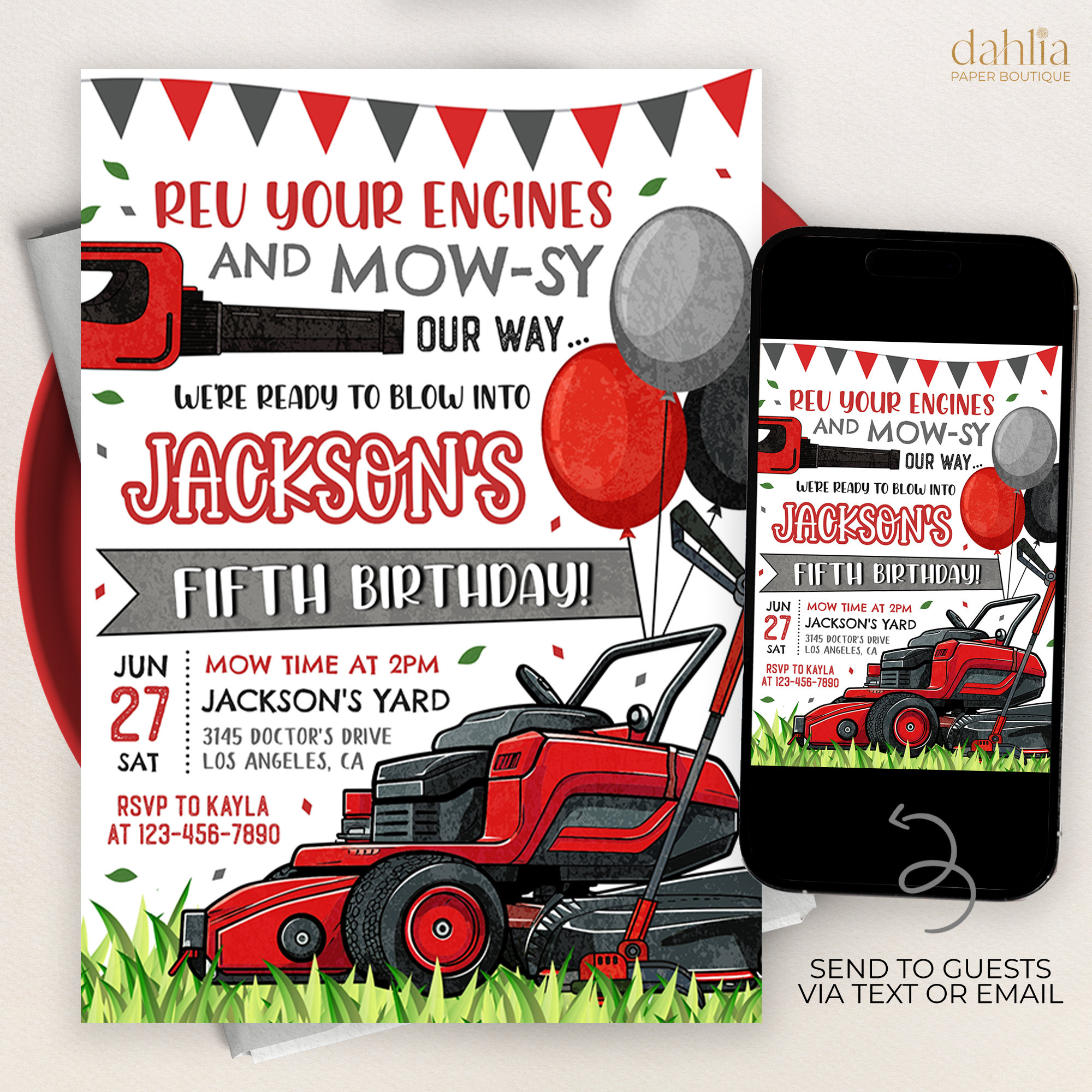 "Invito di compleanno tosaerba, invito alla festa con strumenti da giardino EDITABLE, modello R...