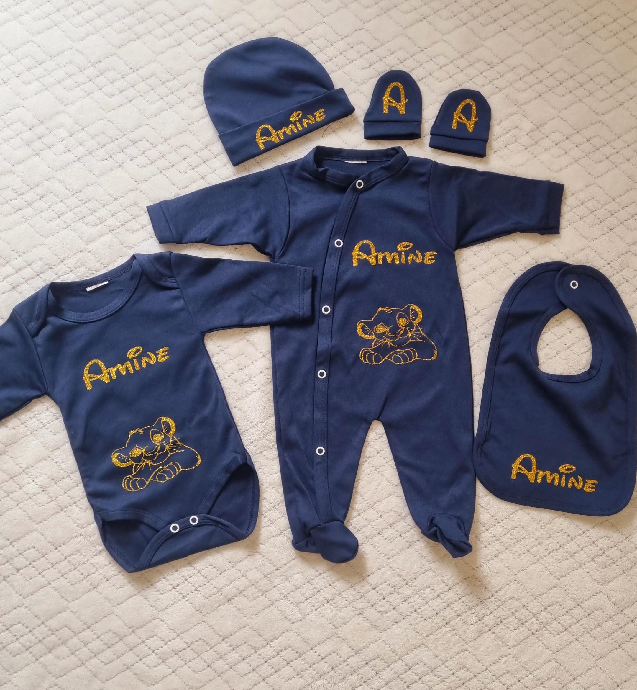 Set da 5 pezzi composto da body, pigiama, cappello, bavaglino e guanti