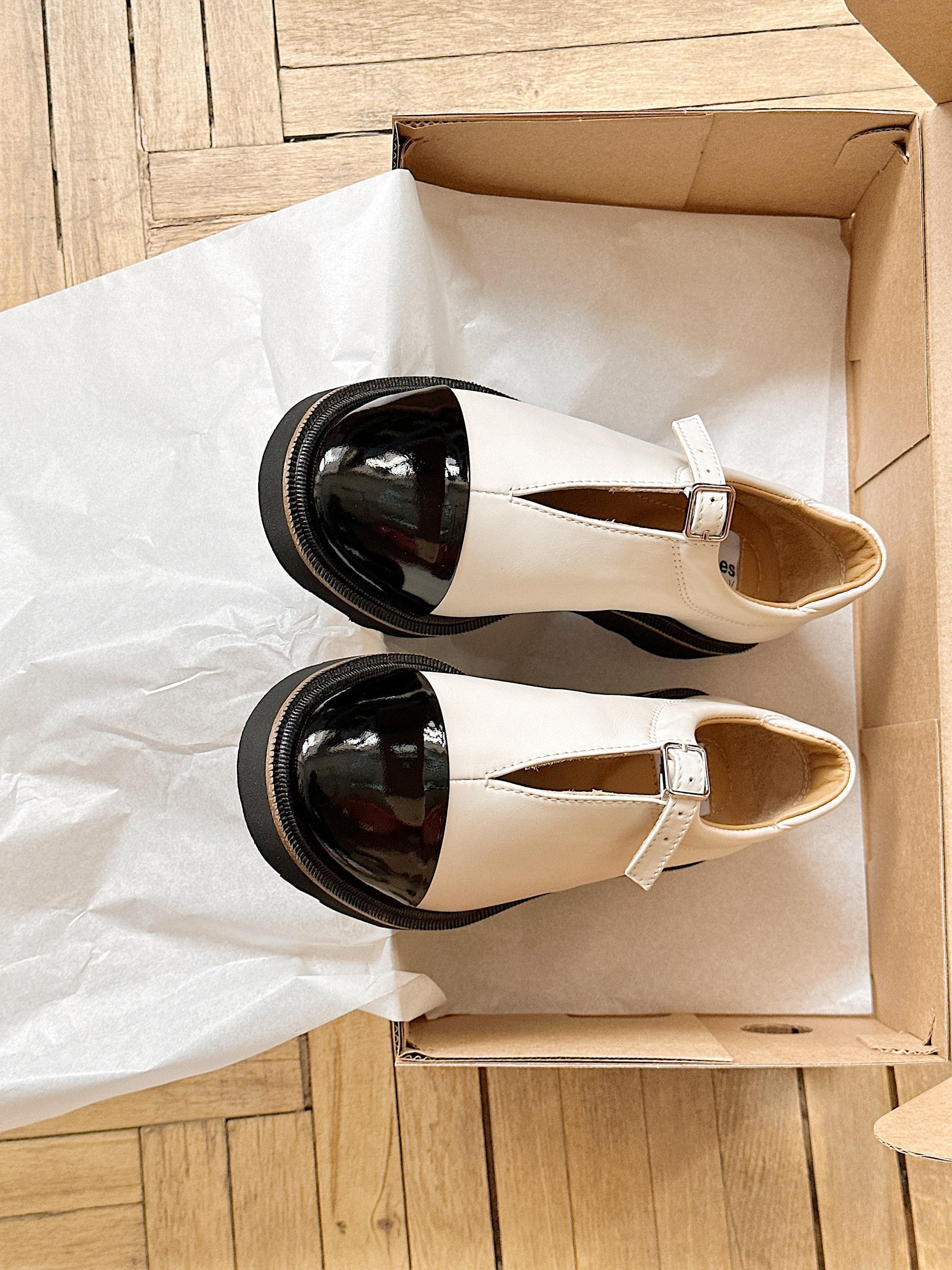 Scarpe Mary Jane in pelle fatte a mano - Ballerine in vernice bianca e nera con cinturino Immergetev...