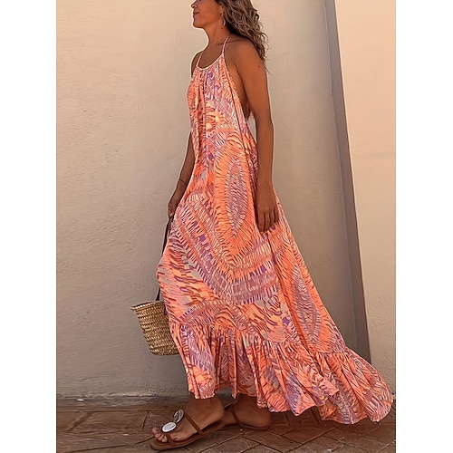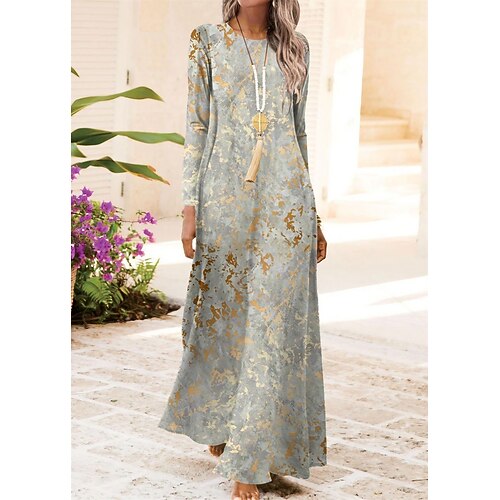 Abito Maxi Donna Vintage Bohemien A Line Abito Collo a Barca Manich...