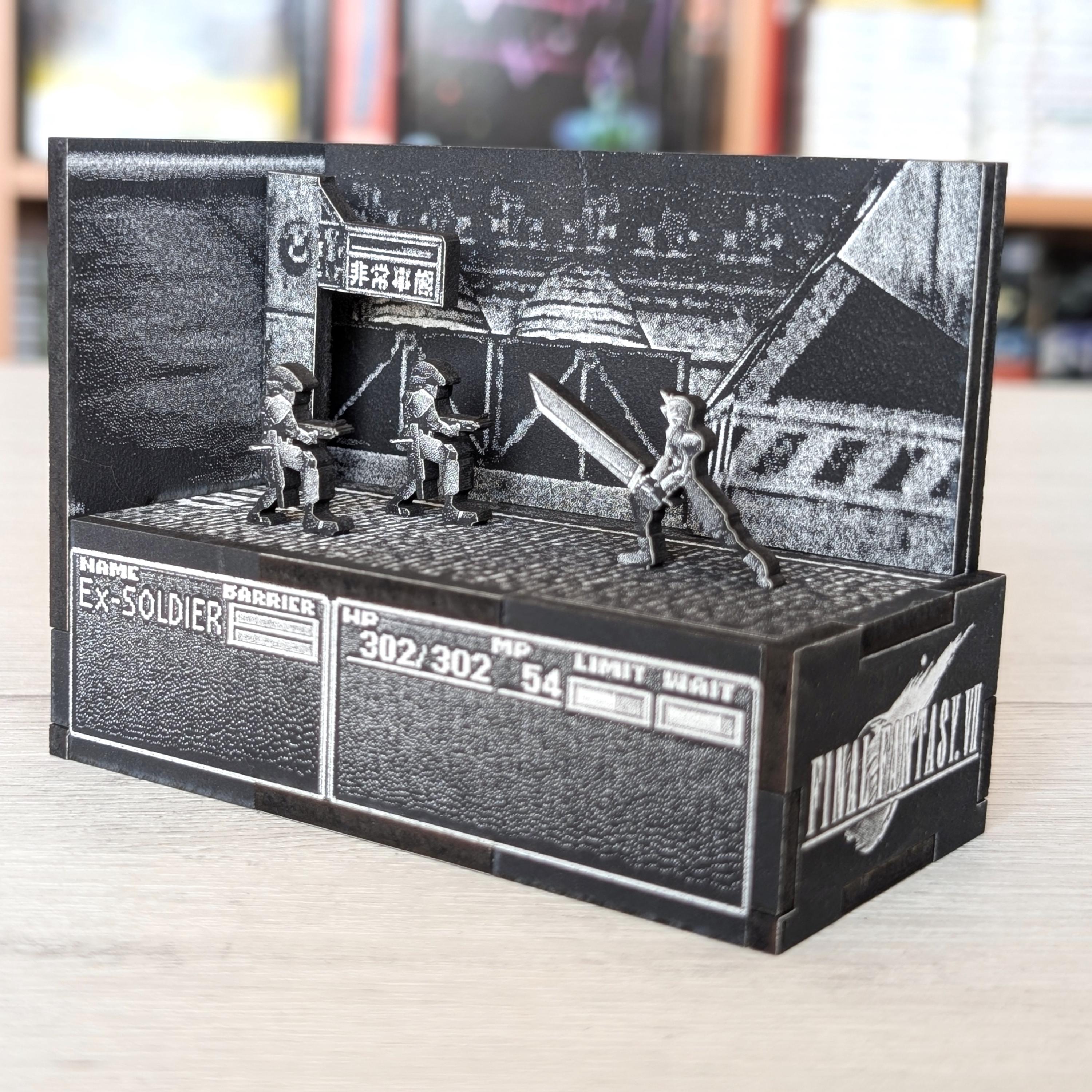 Diorama in legno del videogioco Final Fantasy VII, con la figura di Cloud Strife e i soldati Shinra ...